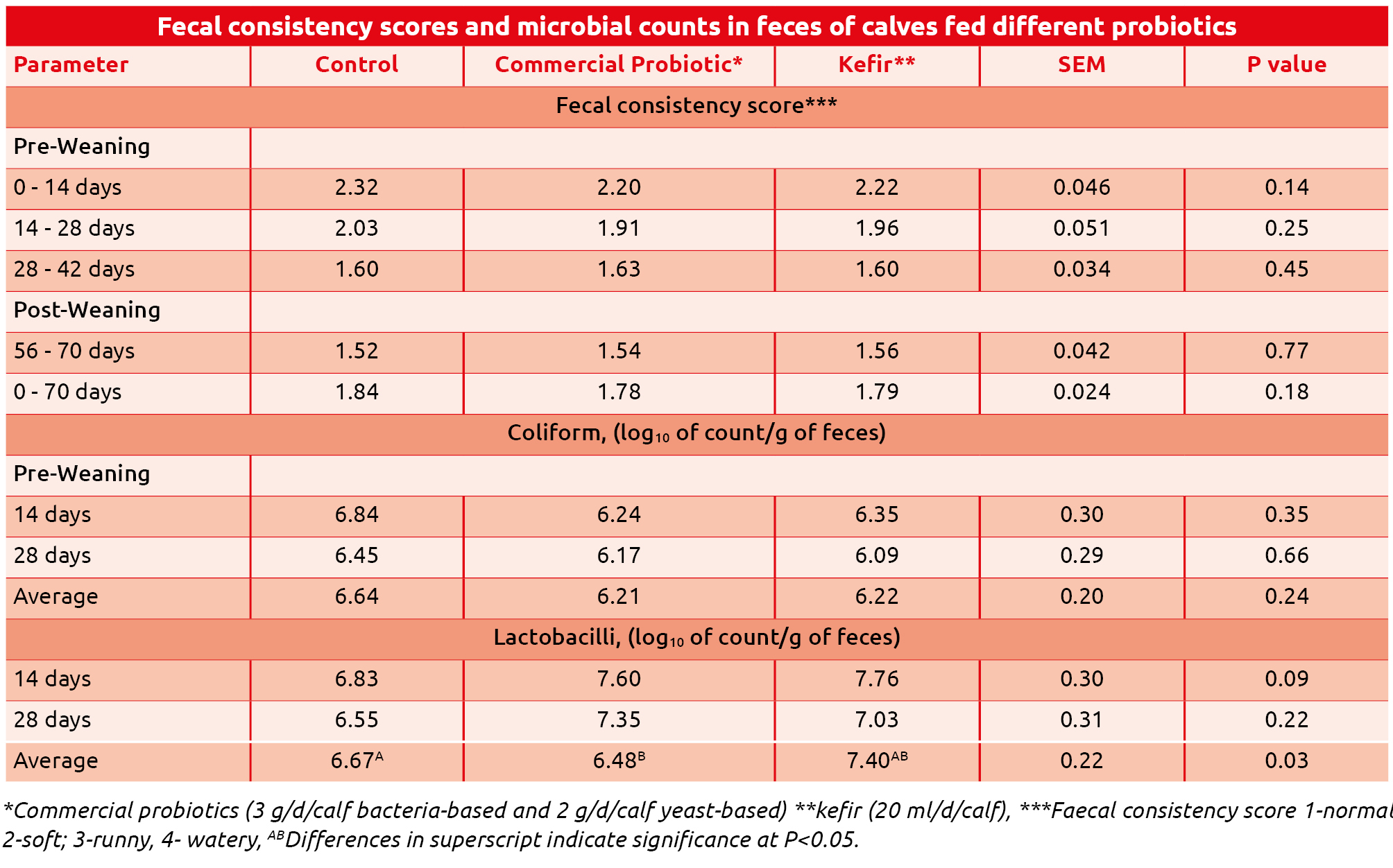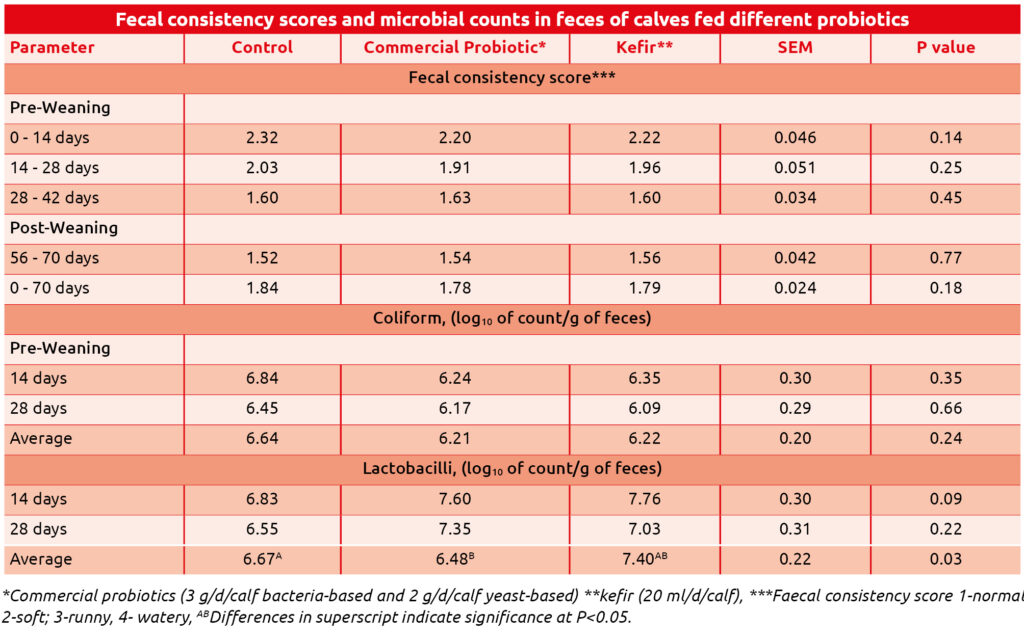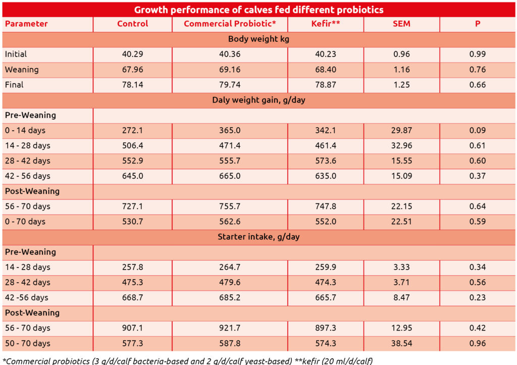 Si riporta una prova eseguita su vitelli alimentati con latte intero e mangime starter a volontà dal 14° gg. Sono stati confrontati il gruppo con supplementazione di lattobacilli e lievito vivo con gruppo trattato con kefir rispetto al gruppo controllo.