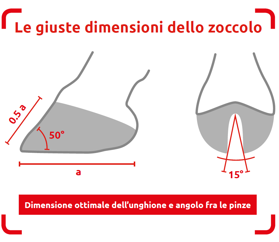 Il corno dovrebbe essere lungo mediamente dai 7,5 agli 8,5 cm, con un’altezza della parte posteriore di circa la metà. Dobbiamo, in ogni caso, prestare attenzione perché capita spesso che tagliare in prossimità dei 7,5 cm possa intaccare la zona di irrorazione della punta. L’angolo del piede sulla parte anteriore va da 50-55°, ma non è un fattore importante perché va regolato in base agli appiombi. Gli unghioni hanno una divaricazione di circa 15°. La parete cresce di circa 5-6 mm al mese.
