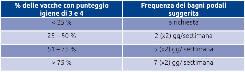 A fare la differenza è senza dubbio la frequenza, il rinnovo e la composizione della soluzione disinfettante utilizzata in vasca (prima di preparare o versare la nuova soluzione, la vasca deve essere accuratamente pulita!). La frequenza non solo potrebbe rivelarsi sufficiente al controllo della diffusione della malattia, ma risulta essere strettamente collegata al tipo di igiene che viene assicurato agli animali. Trattamenti a giorni alterni sono meno efficaci di un ciclo di trattamenti continui (mattina e sera) di alcuni giorni, così come il passaggio in una vasca di acqua prima del bagno podale non riscontra un’efficacia superiore.