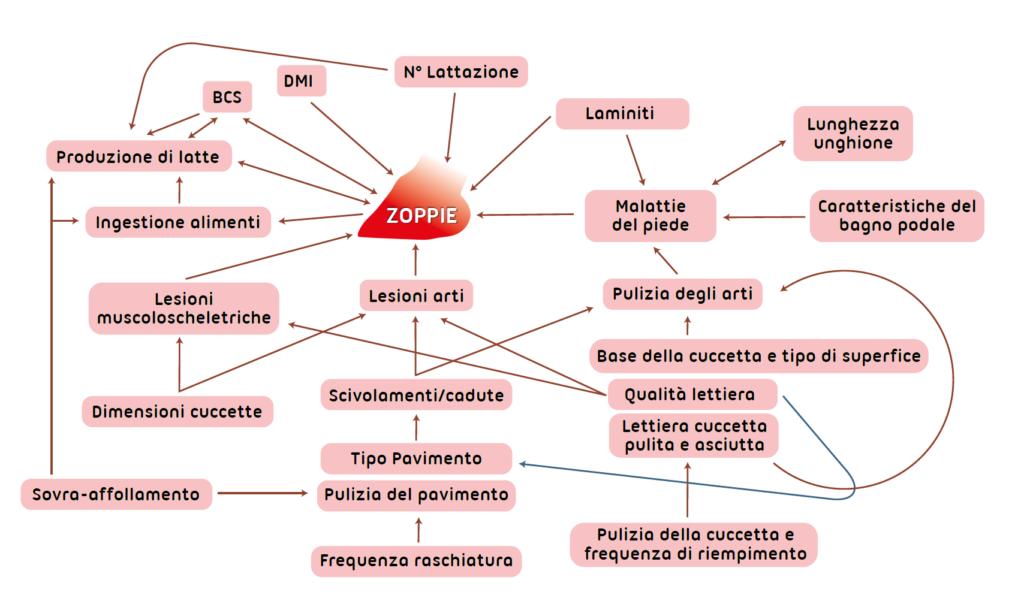 Schema riassuntivo della interconnessione tra zoppie, malattie e produzione di latte (Solano et al., JDS 2015)