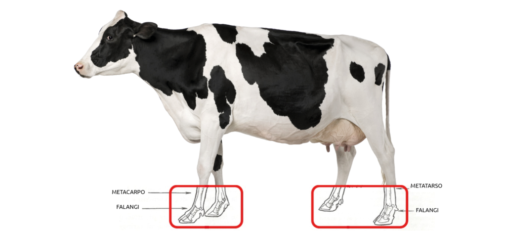 Il piede bovino è costituito da due dita, ed ognuna di esse è a sua volta formata da tre falangi, di cui l’ultima e la parte terminale della seconda falange, insieme all’osso sesamoideo distale, sono ricoperte da una formazione cornea chiamata unghione, che poggia direttamente sul terreno. La posizione in stazione è resa possibile dalla fissazione di legamenti e dei muscoli, quali flessori ed estensori, che permettono all’animale di rimanere in equilibrio. Il movimento viene effettuato tramite uno slittamento ritmico e coordinato del centro di gravità verso l’avanti ed è ottenuto tramite un impulso motore del treno posteriore.