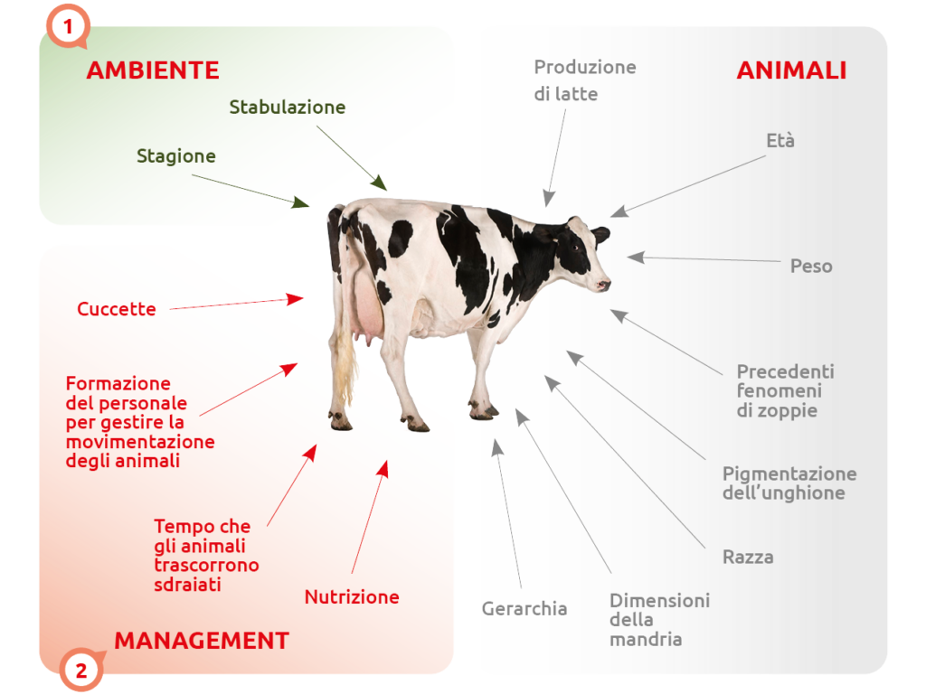 Ci sono molti fattori che influenzano la zoppia, e questi possono essere raggruppati in fattori ambientali, gestionali e animali.