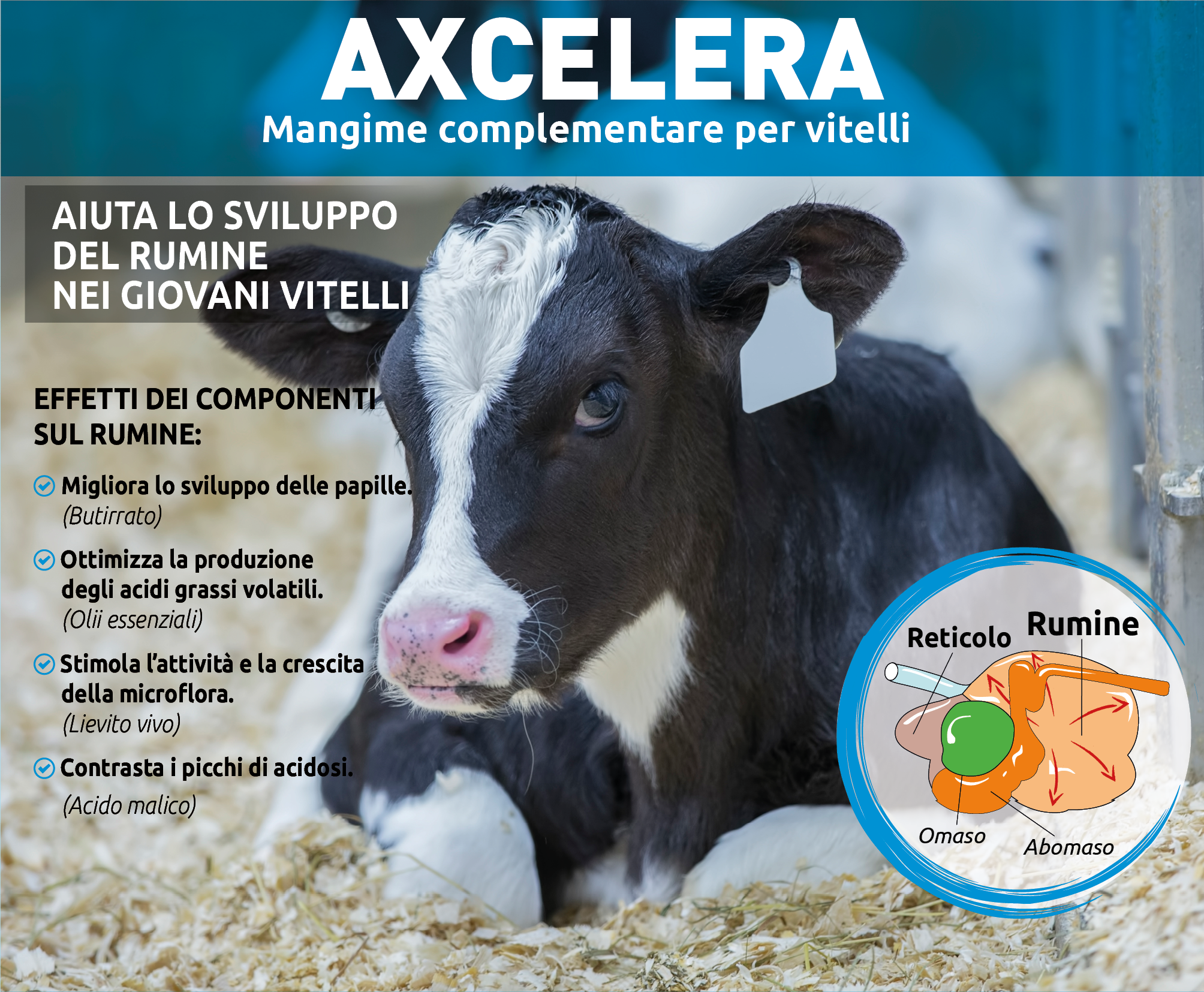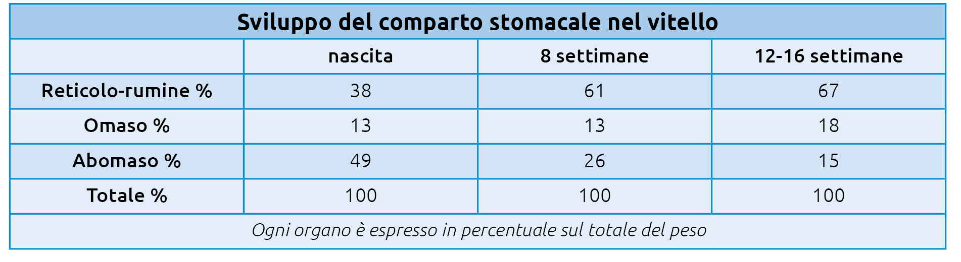L’abomaso dei vitelli appena nati è l’unico stomaco completamente sviluppato e funzionale ed è anche l’organo digestivo più importante per i vitelli alla nascita. La digestione di grassi, carboidrati e proteine dipende principalmente dagli enzimi digestivi secreti dall’abomaso e dall’intestino tenue, che è simile al sistema digestivo degli animali monogastrici. Nel corso del tempo, con l’aumento dell’apporto di alimenti solidi, il rumine inizia a svilupparsi e a svolgere ruoli digestivi più importanti.