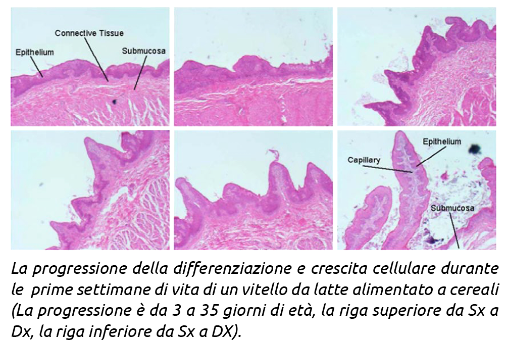 La proliferazione e la crescita dell’epitelio squamoso del rumine promuove la crescita della lunghezza e della larghezza delle papille e aumenta lo spessore della parete interna del rumine. I vitelli appena nati hanno un pavimento liscio senza papille prominenti. È dimostrato che i vitelli alimentati esclusivamente con latte hanno uno sviluppo ruminale limitato. Al contrario, una maggiore assunzione di alimenti solidi contribuisce al rapido sviluppo della fermentazione ruminale con effetti positivi sul peso del rumine, crescita papillare, grado di cheratinizzazione e sviluppo della muscolatura.