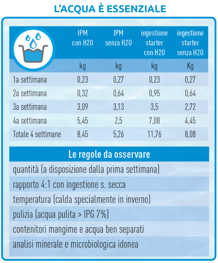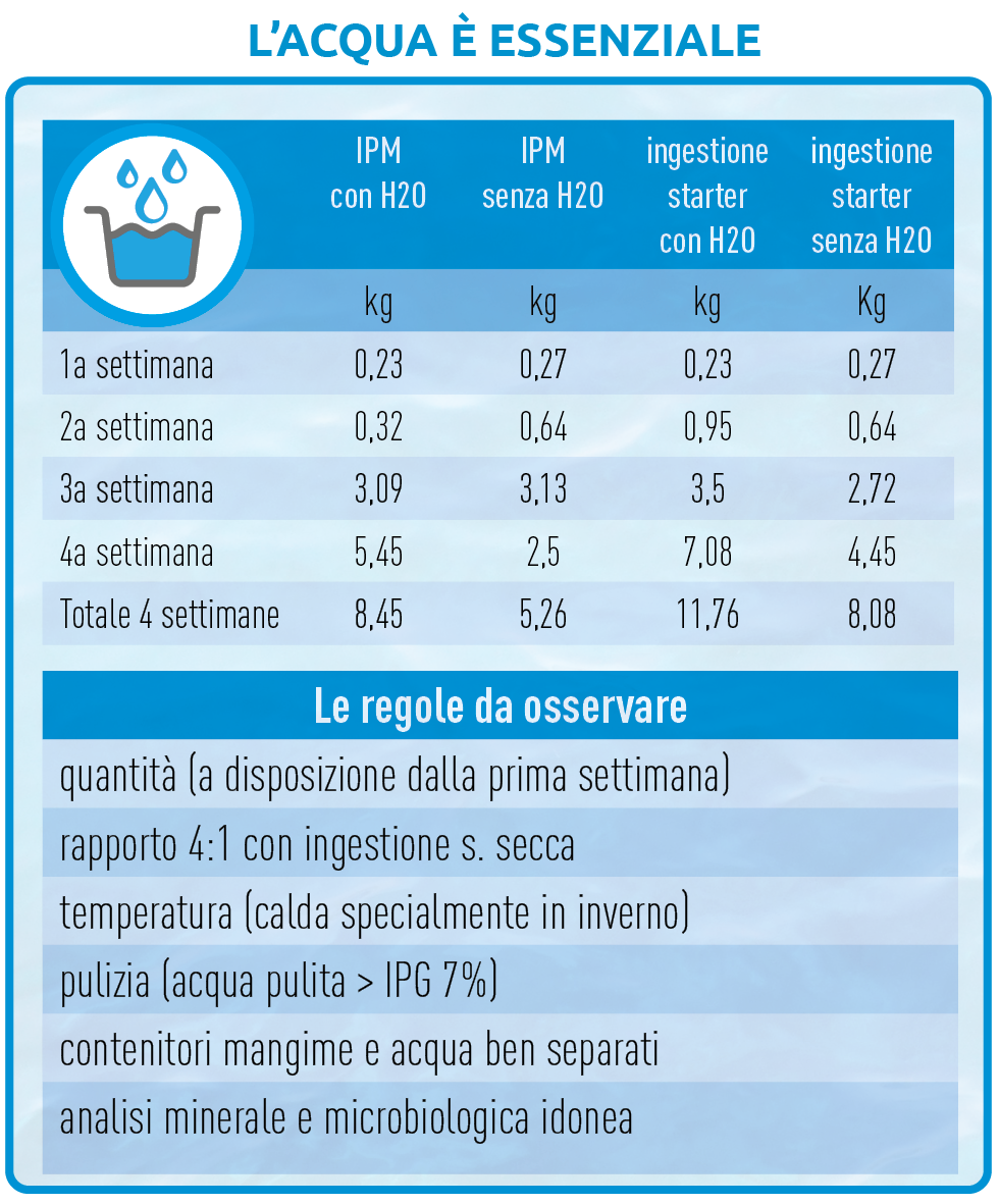 È dimostrato il beneficio che si ottiene nel fornire l’accesso all’acqua ai vitelli. La sua disponibilità sin dalle prime fasi della loro vita nell’alimentazione favorisce un incremento del peso corporeo, un miglioramento dell’assunzione di alimento starter e una riduzione delle problematiche gastro-intestinali. È errata la convinzione che per il vitello sia sufficiente l’acqua del latte.