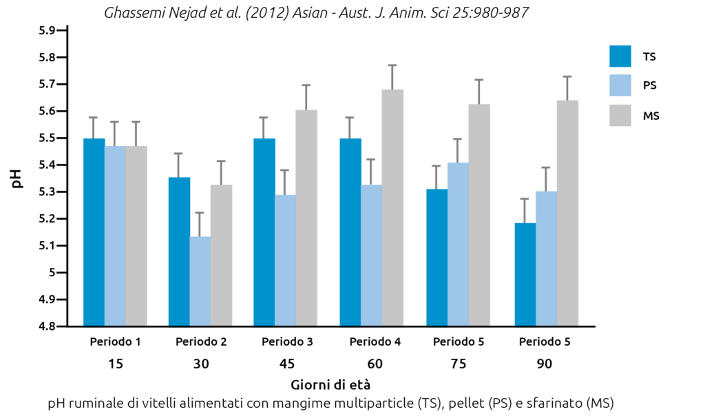 Per quanto riguarda la forma fisica è dimostrato che il pellet da risultati migliore dello sfarinato. Il dibattito resta aperto quando si confronta il pellet con il cosiddetto “multiparticle” che presenta le materie per la maggior parte “a vista” e con granulometria varia. Quest’ultimo sta dando risultati decisamente interessanti sia dal punto di vista dell’ingestione sia degli accrescimenti, ma soprattutto sullo stimolo ruminale e quindi sullo sviluppo delle papille e la composizione degli AGV, nonché sul pH.