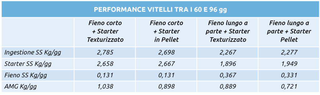 Recenti studi hanno rilevato che l’integrazione del mangime starter con foraggio macinato corto migliora l’ingestione l’accrescimento e la digeribilità della razione. Gli alimenti con fibra strutturata stimolano la produzione di saliva durante la masticazione e la ruminazione che forniscono urea e minerali, come il bicarbonato di sodio, che aiutano a mantenere la normale crescita e lo sviluppo microbico del rumine. I foraggi grossolani sono importanti per favorire la crescita dello strato muscolare del rumine e per mantenere la salute dell’epitelio.