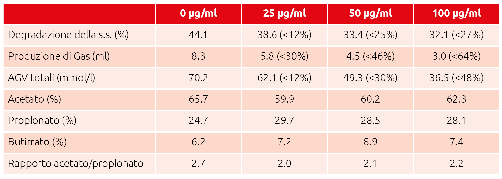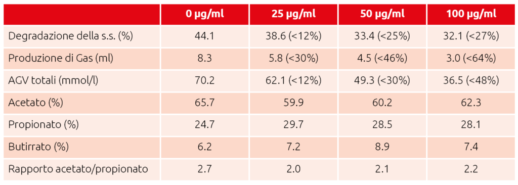 Molte micotossine, a loro volta, possiedono però una capacità antimicrobica, antiprotozoaria e antifungina sulla flora ruminale. Infatti, i parametri indicativi di una buona funzionalità ruminale quali la percentuale di degradazione di sostanza secca, la produzione di gas o di acidi grassi volatili e il quantitativo di proteina microbica prodotta risultano decisamente compromessi in caso di micotossicosi come emerge nei risultati degli studi riportati nelle Tabelle 1 e 2 (C.A. Sgoifo Rossi et al. Large Animal Review 2011).