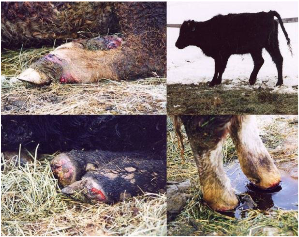 Gli alcaloidi dell’Ergot possono indurre gravi vasocostrizioni delle piccole arterie. Le aree del corpo maggiormente interessate sono le estremità, orecchi e coda. Questo può portare a zoppie nei ruminanti e nei casi estremi, all’infiammazione delle giunture distali può conseguire la perdita dello zoccolo o la gangrena.