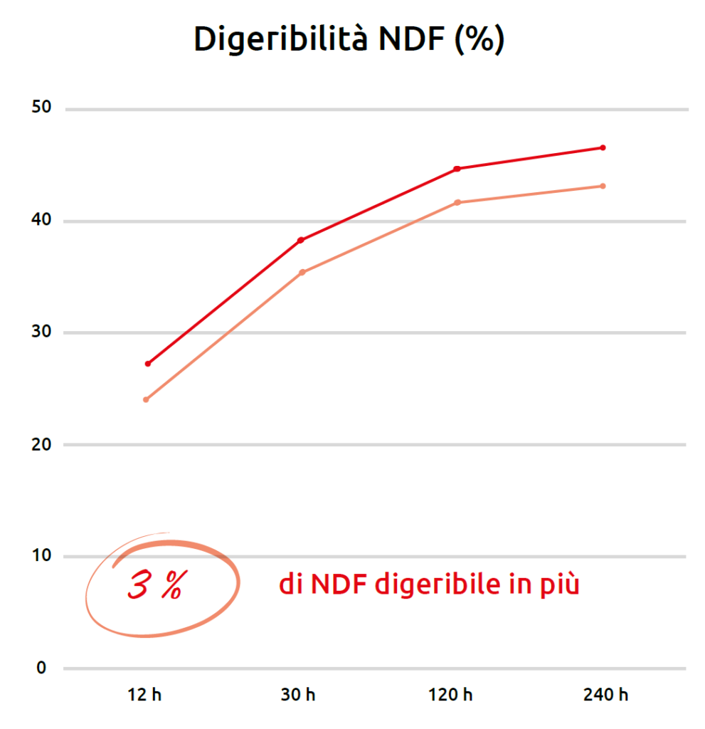 La digeribilità della fibra neutro detersa (NDF) condiziona fortemente il valore energetico dell’alimento, l’ingestione volontaria di sostanza secca e le performance.