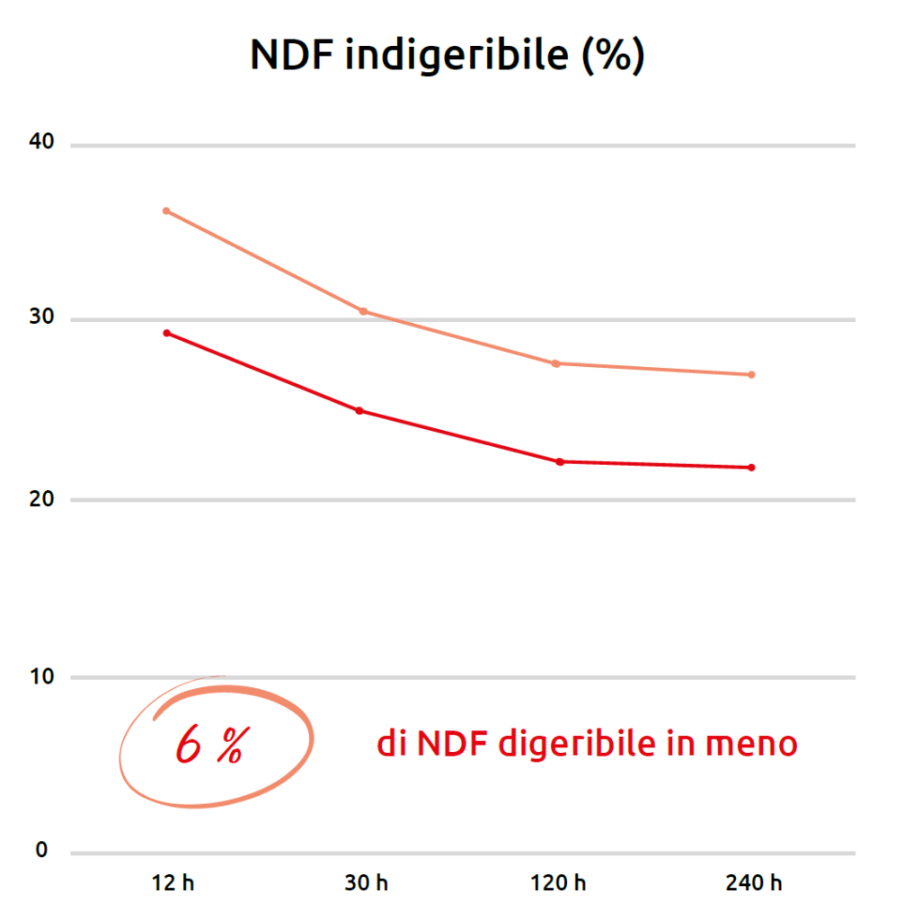 Dal confronto emerge come l’NDF del foraggio trattato con AGECON 2 sia più digeribile di circa il 3% rispetto al foraggio non trattato e che l’NDF non digerita sia mediamente il 6% in meno.