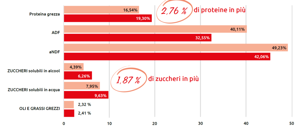 Si nota chiaramente dai dati riportati nel grafico sottostante come sia significativamente più elevato il titolo proteico della medica trattata con AGECON 2* (2,76% in più), così come sono più elevati il titolo in zuccheri (1,87% in più) e in oli e grassi grezzi (0,09%).