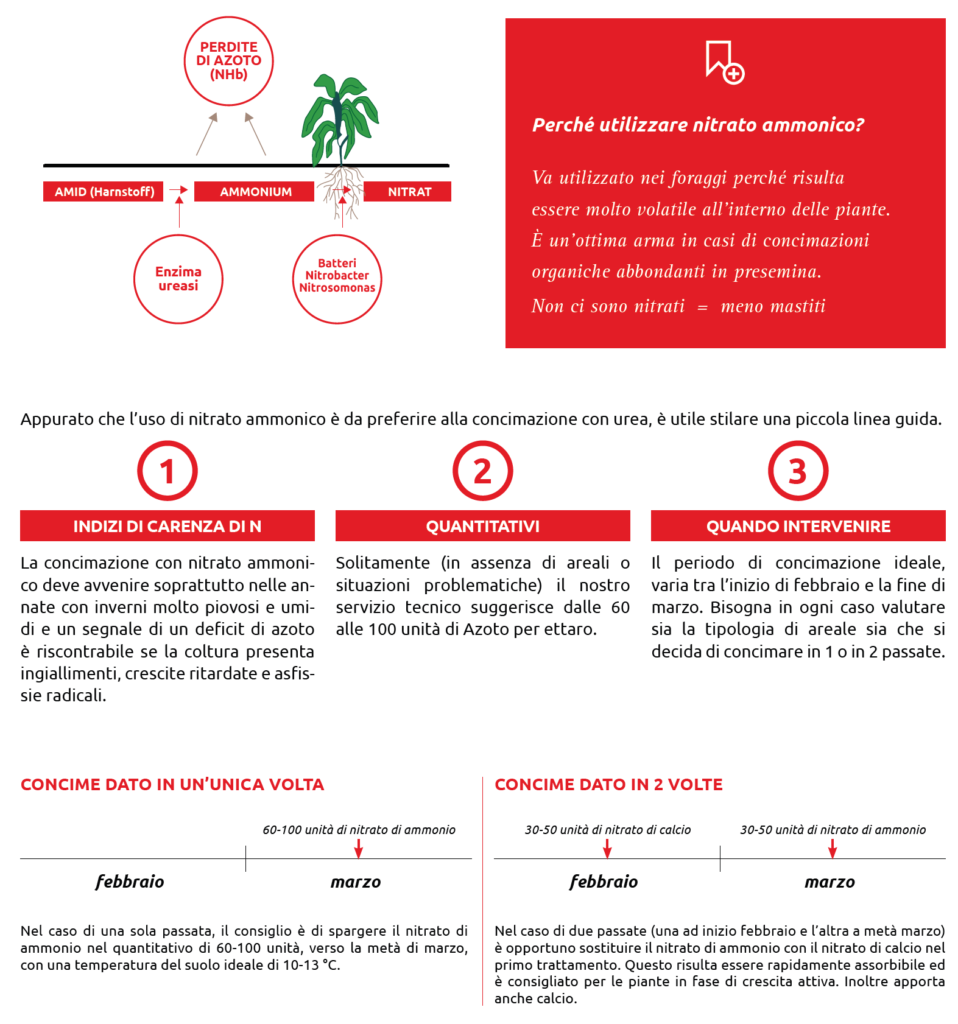 Uno dei fattori che determina un prodotto di qualità è un’integrazione di macroelementi nutritivi, come azoto (N), fosforo (P) e potassio (K), di cui le piante hanno particolare necessità per il loro accrescimento. Tra questi, l’apporto di azoto attraverso concimi azotati, sia organici sia minerali, risulta essere indispensabile per una corretta crescita e produzione; un eccesso o una scorretta gestione, però, provoca un aumento della concentrazione dei nitrati nel terreno e di conseguenza nei foraggi. La successiva riduzione in nitriti, che può avvenire direttamente nella pianta oppure nel rumine del bovino, è causa di molti problemi sanitari e non solo.