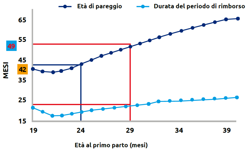 I costi sostenuti per allevare una manza, inoltre, rientreranno positivamente nel bilancio aziendale in minor tempo se la manza entra più velocemente in produzione. Diversi studi riportano come una manza che partorisce a 24 mesi rientra nei costi sostenuti dall’allevatore per la sua gestione a 42 mesi di età. Questo numero aumenta all’aumentare dell’età al primo parto, arrivando a 49 mesi per una manza che ha partorito a 29 mesi di età. (Grafico 1)