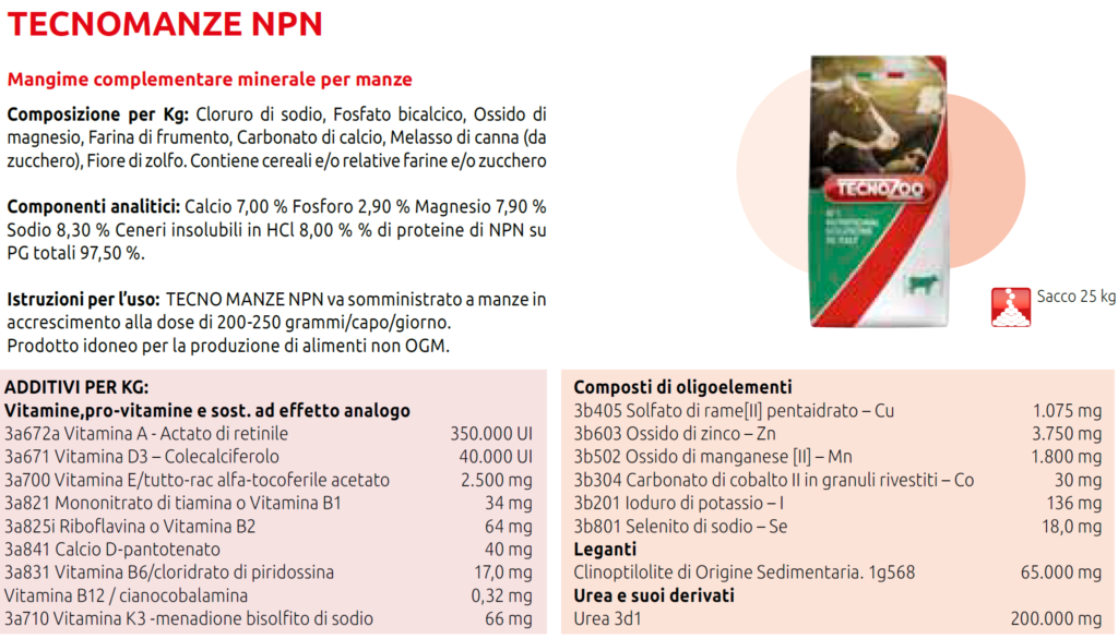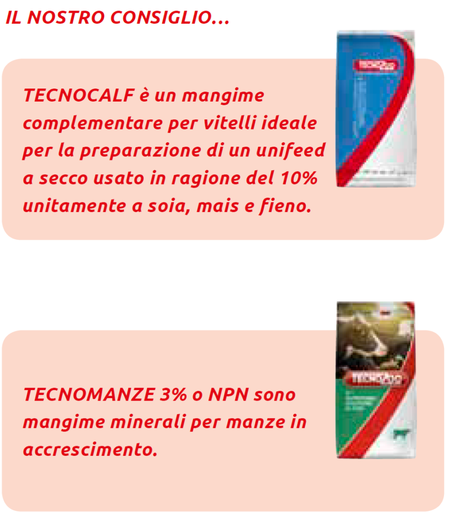 A partire dai 6-8 mesi la manza necessita di ulteriore unifeed specifico, a questo scopo utili sono i prodotti TECNOMANZE 3%, prodotto vitaminico-minerale completo, e il TECNOMANZE NPN, che comprende una quota di urea.