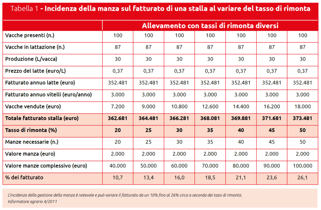 Un numero limitato di animali permette di controllare e ridurre notevolmente i costi legati all’allevamento della manza in termini di gestione e alimentazione. Nello specifico, all’aumentare del tasso di rimonta aumenta anche l’incidenza della gestione della manza sul fatturato aziendale che può variare da un 10% (tasso di rimonta 20%) fino al 21% (tasso di rimonta 40%).