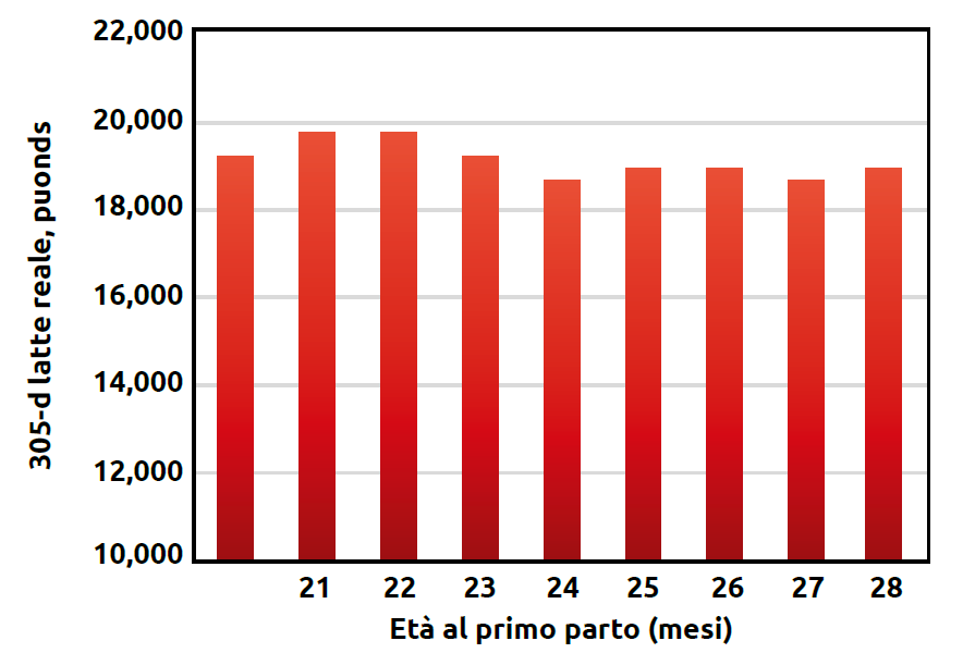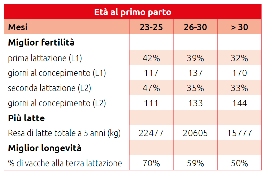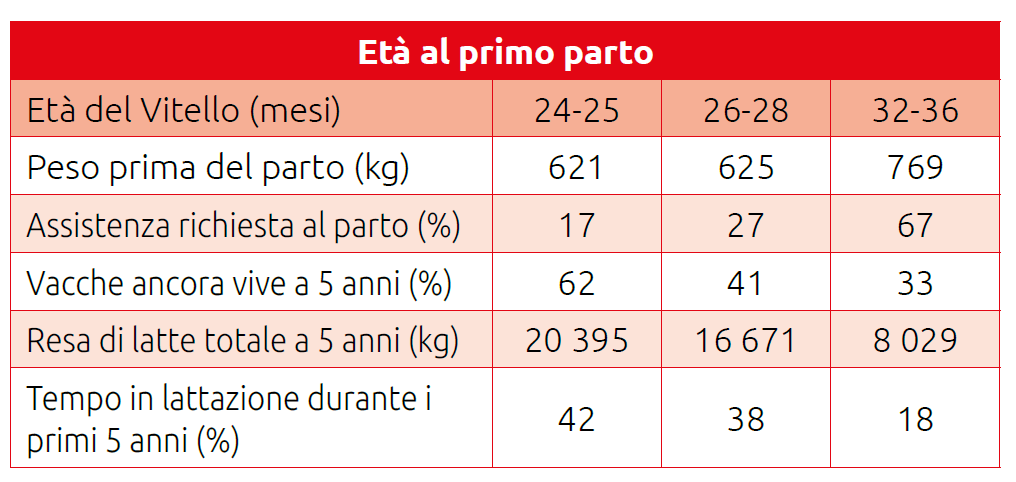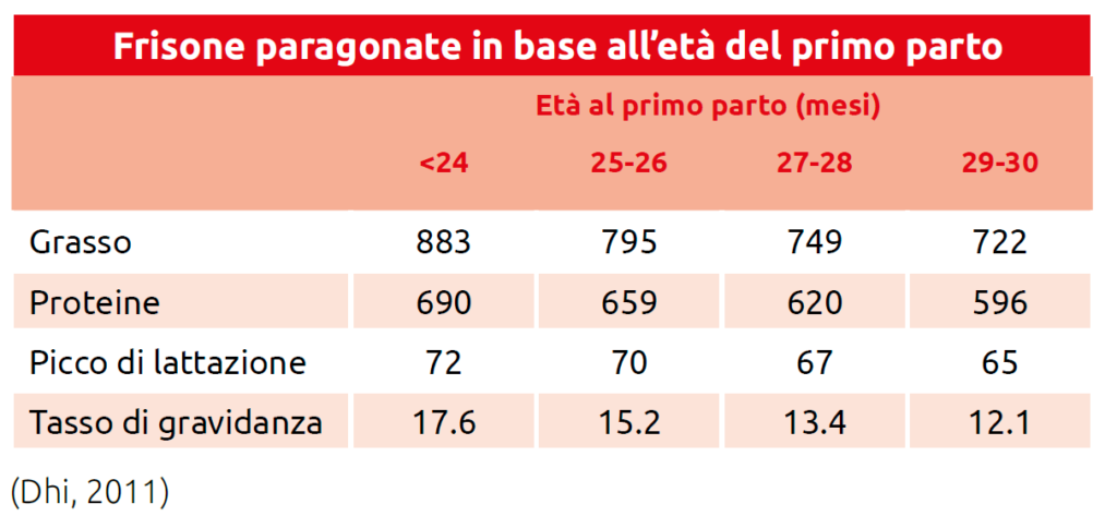 Se adeguatamente alimentate e allevate le manze che partoriscono giovani (24-25 mesi) non risultano in modo significativo più piccole o meno pesanti delle manze più tardive (26-28 mesi) e hanno bisogno di minor interventi da parte dell’allevatore durante il parto.