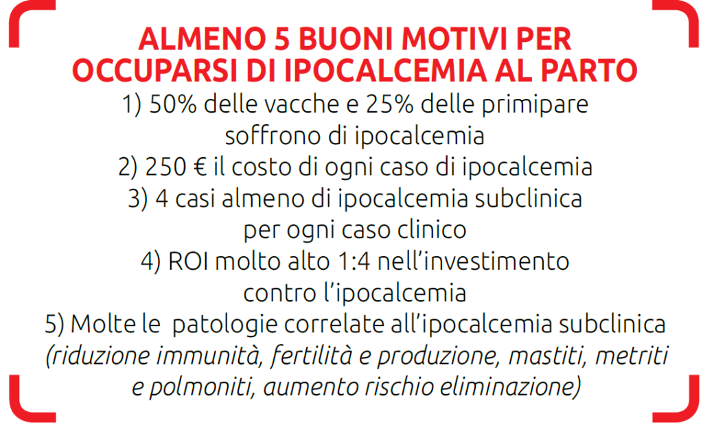 Il costo complessivo di questo triplice approccio si aggira intorno ai 35-40 € per vacca partorita con un ROI di 1:4 sui 250 € a caso di ipocalcemia che rischia di coinvolgere circa il 50% della mandria, in normali corrette condizioni gestionali di allevamento.