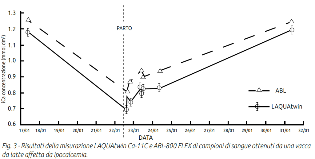Parliamo di ipocalcemia subclinica (SCH) quando i valori di calcio nel siero totale sono < 2,0 mM/dl (8,0 mg/dl) e di ipocalcemia clinica (CH) (la cd febbre da latte o collasso puerperale) quando i livelli sierici di Ca sono < 1,5 mM/dl (6,0 mg/dL; Goff, 2008); altri studi indicano però intervalli diversi per determinare la gravità dell’ipocalcemia; Chapinal et al. (2012) parla di normocalcemia a livelli sierici di Ca > 2,20 mM/dl; Goff (2008) di calcemia normale in un intervallo compreso tra 2,12 e 2,50 mM/dl e per Martinez et al. (2012) sono livelli soglia di calcemia normale valori > 2,14 mM/dl. Le forme di ipocalcemia subclinica, proprio perché inapparenti, sono più subdole di quelle cliniche evidenti ma non meno impattanti perché sono assai diffuse (circa il 50% delle pluripare e il 25% delle primipare), possono compromettere longevità e produttività della bovina (Goff, 2008; Murray et al., 2008) e non sono facilmente identificabili. Oggi fortunatamente si è reso disponibile un valido test di campo per la determinazione della calcemia in stalla denominato LAQUAtwin Ca-11C, attualmente l’unico metodo affidabile a prezzo basso per effettuare test in allevamento (paragonabile, come si vede in figura 3, ad ABL-800 FLEX (gold standard di laboratorio per la determinazione della calcemia)).
