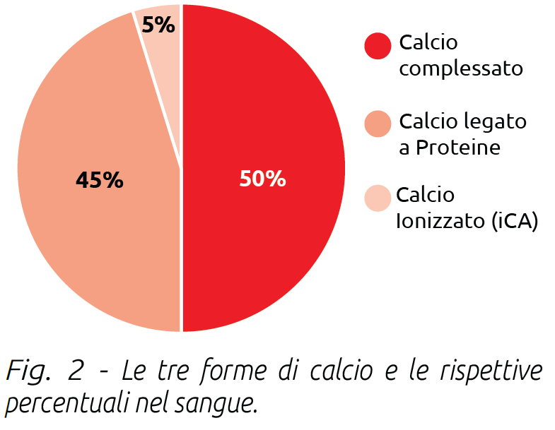 Calcio non diffusibile legato principalmente all’albumina; complessi diffusibili di calcio con lattato, bicarbonato, fosfato, solfato, citrato e altri anioni e calcio ionizzato diffusibile (Ca2+). Il calcio complessato rappresenta circa la metà del calcio sierico totale e il calcio non diffusibile e ionizzato rappresentano rispettivamente il 45% e il 5% del totale. Il calcio ionizzato è la forma fisiologicamente attiva; la sua concentrazione è regolata dalla ghiandola paratiroidea. Una diminuzione del calcio sierico ionizzato può causare contrazioni muscolari involontarie e sintomi neurologici correlati, indipendentemente dalla concentrazione sierica totale di calcio2+.