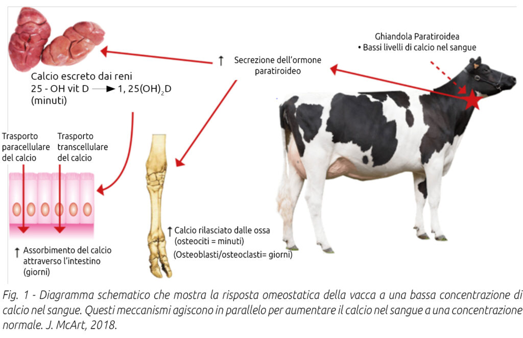 Con il parto e l’inizio della lattazione le vacche devono affrontare una sfida importante: mantenere l’equilibrio del calcio nel sangue! In questa fase, infatti, le richieste fisiologiche di calcio della lattazione superano la capacità di assorbimento dalla normale dieta, per cui si instaurano dei meccanismi di mobilizzazione dalle ossa e un maggior assorbimento intestinale di calcio. Questi meccanismi non sono però immediati e nel frattempo possono verificarsi situazioni di ipocalcemia. (vedi fig. 1)