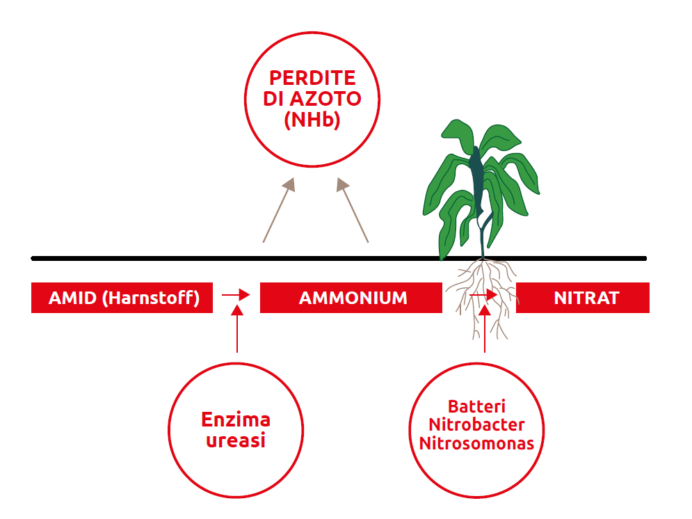 Questo processo avviene in due fasi. La prima prevede l’intervento dell’enzima ureasi che la trasforma in ione ammonio; questo passaggio è relativamente lento e richiede, a seconda della temperatura del suolo, da 1 a 4 settimane. Se il terreno non ha una temperatura adeguata la reazione non procede.