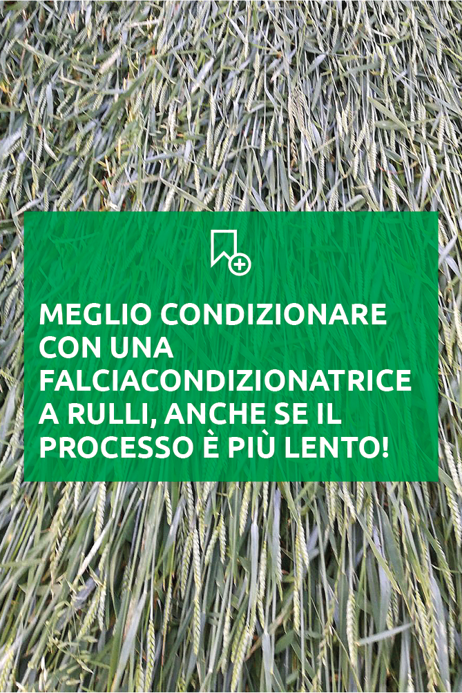 Le moderne macchine per il taglio dei foraggi si dividono in due categorie: falciatrici e falciacondizionatrici. Queste ultime non solo recidono le piante, ma le trattano anche: schiacciano lo stelo, provocando fessure che accelerano il processo di appassimento. L’erba viene raccolta più rapidamente e con meno rischi di incappare in un temporale, favorendo anche il mantenimento del contenuto proteico del foraggio. Durante il processo di appassimento, infatti, il foraggio continua a perdere proteine; pertanto, se secca più rapidamente, minore è il decadimento proteico.