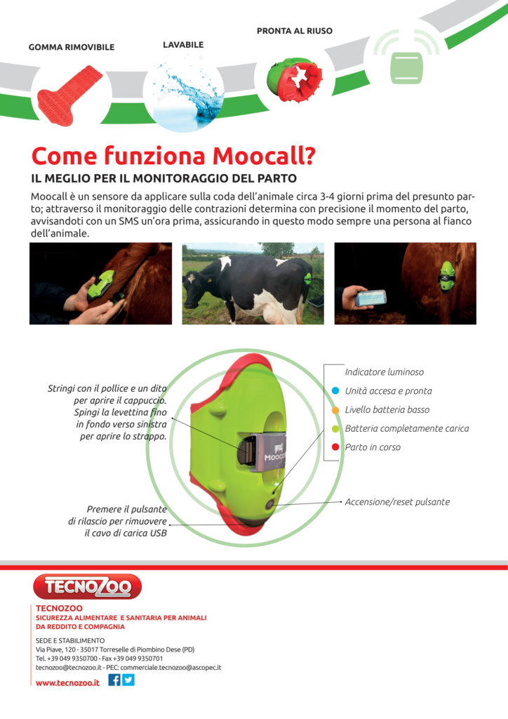 Moocall è un sensore da applicare sulla coda dell’animale circa 3-4 giorni prima del presunto par to; attraverso il monitoraggio delle contrazioni determina con precisione il momento del parto, avvisandoti con un SMS un’ora prima, assicurando in questo modo sempre una persona al fianco dell’animale.