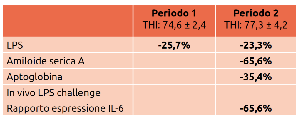 Sull’espressione delle citochine sono state condotte 3 analisi: con o senza stimolazione LPS, e il rapporto tra i due risultati. Il trial è stato diviso in due periodi: il primo con stress da caldo moderato e il secondo con heat stress intenso.