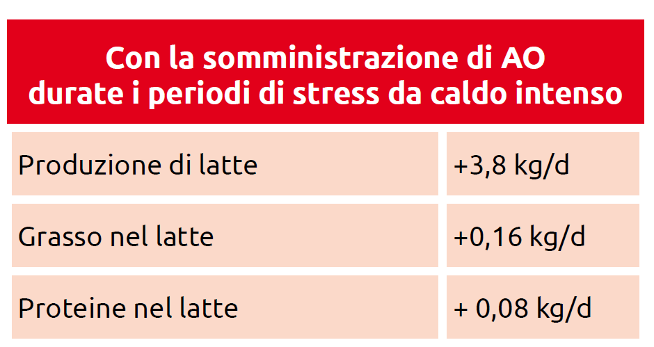 Nel secondo periodo, con stress da caldo intenso, invece, la somministrazione di AO ha incrementato sia la produzione di latte che di grasso e proteine rispettivamente di 3,8, 0,16 e 0,08 kg/d. Si confermano quindi gli effetti positivi dell’AO durante lo stress da caldo nel migliorare la produzione di latte e nel ridurre la temperatura corporea delle vacche in lattazione.